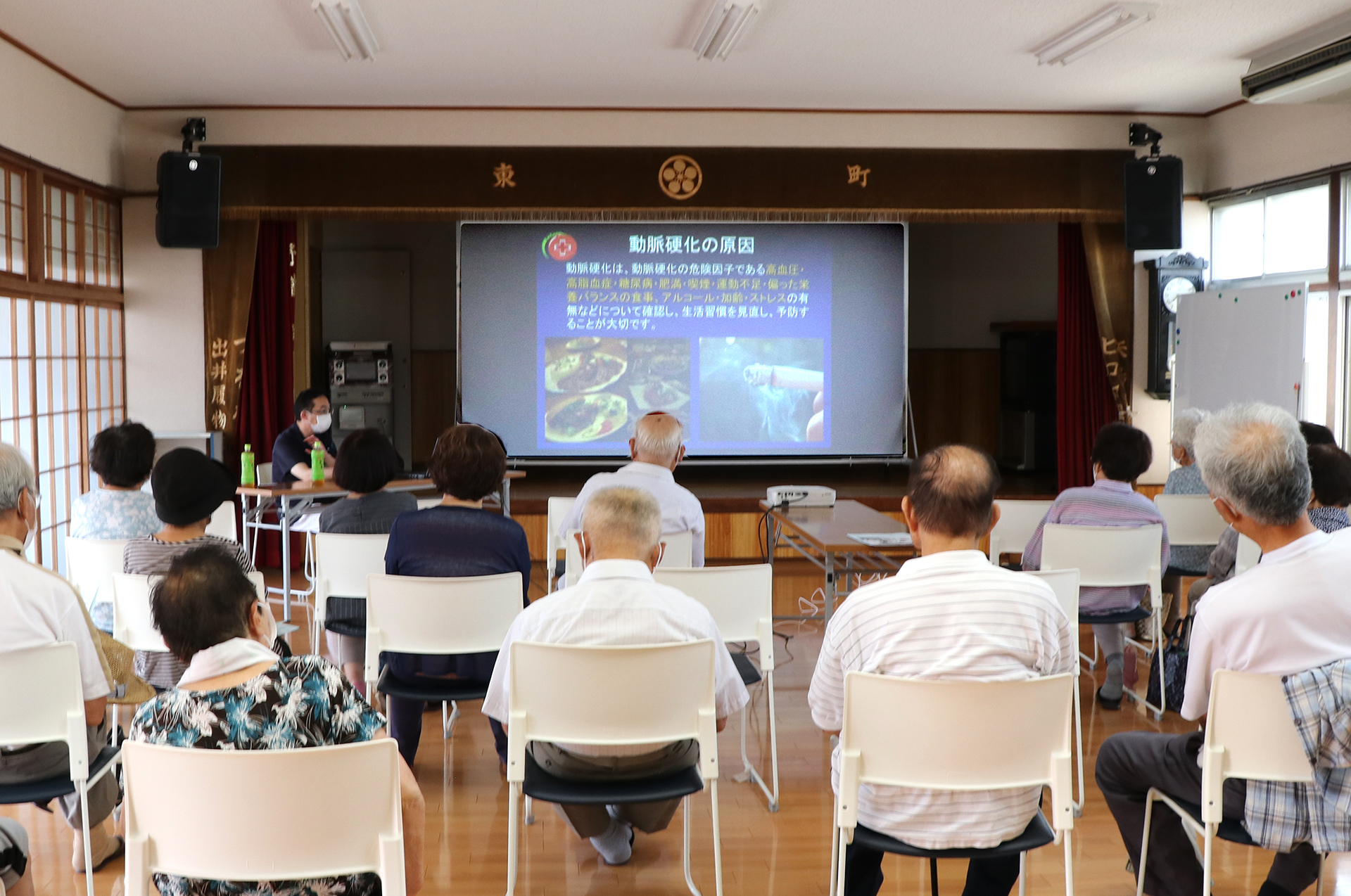 【動脈硬化のお話し】講師、羽生総合病院、栗原先生。場所は東町公会堂。当日は急遽、コロナBA.5の急増により目玉である血管年齢測定が中止となった為聴衆は20人となりました。原因と症状、予防について皆様真剣に聞いていました。大いに為になったようです。